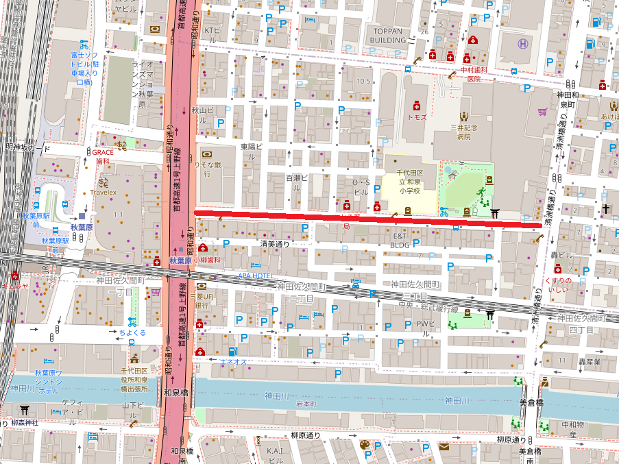 秋葉原駅の東側、和泉公園に面する道路の昭和通りから清洲橋通りまでの区間(約400メートル)で無電柱化工事が行われています。