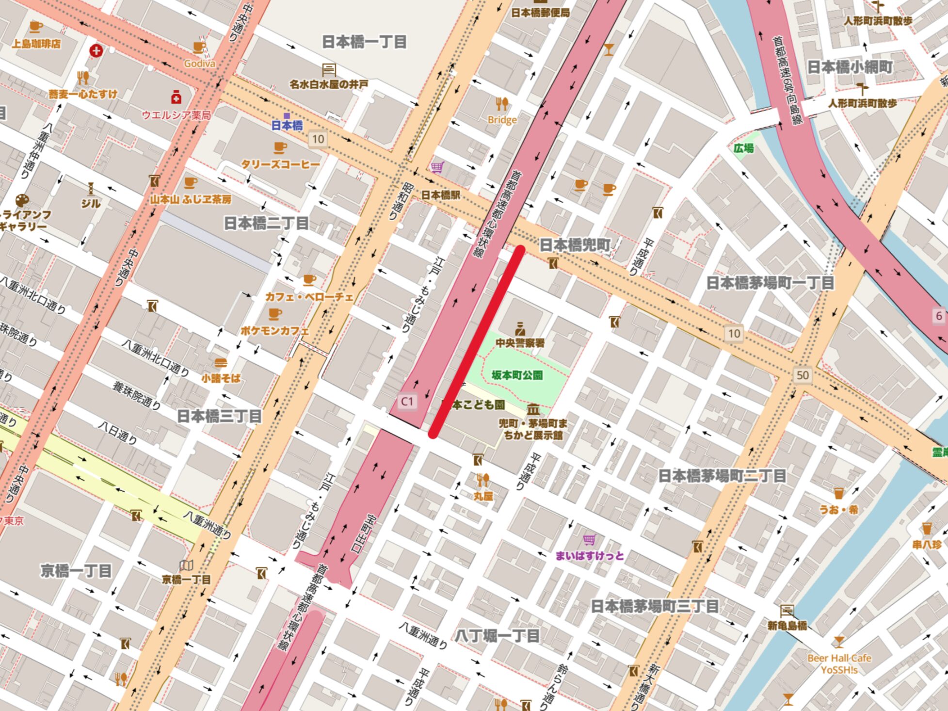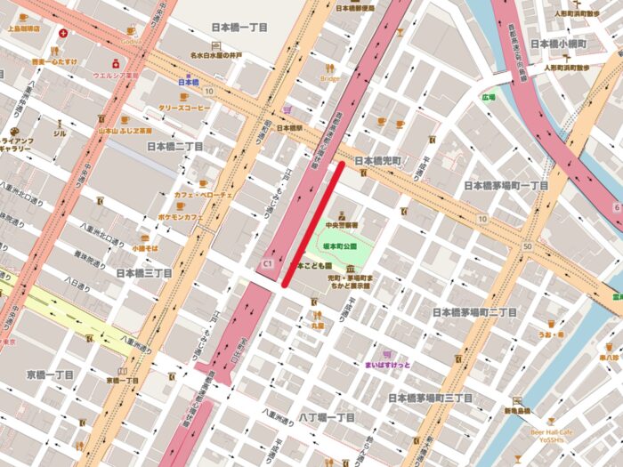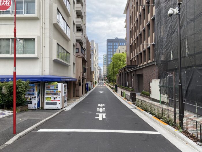 中央区日本橋兜町の区道で無電柱化が完了しました。一方通行の道路で片側のみに歩道があります。沿道には中央警察署、坂本町公園、阪本小学校、新場橋区民館があり、重要施設が集まっているため優先的に整備されたと思われます。