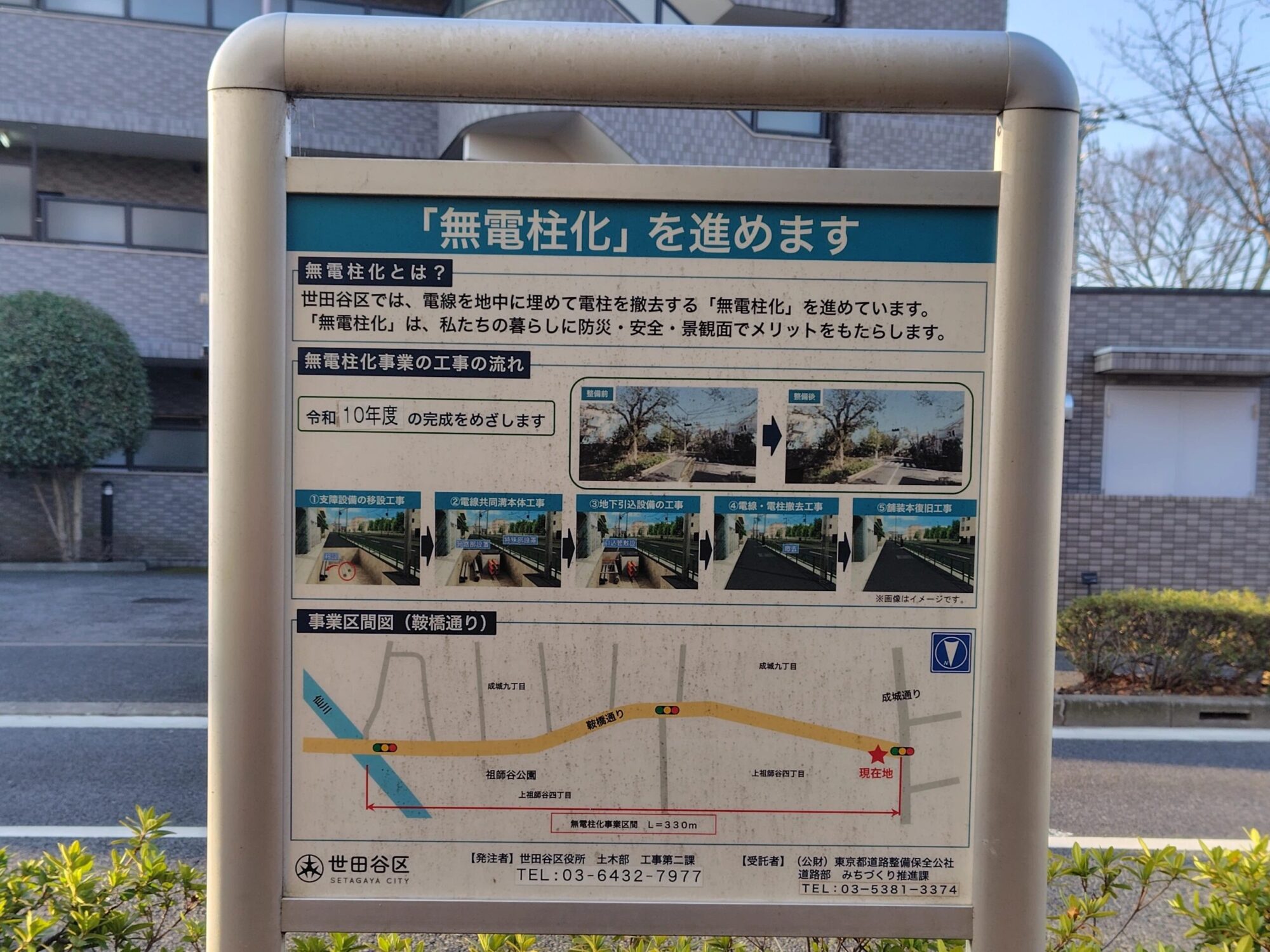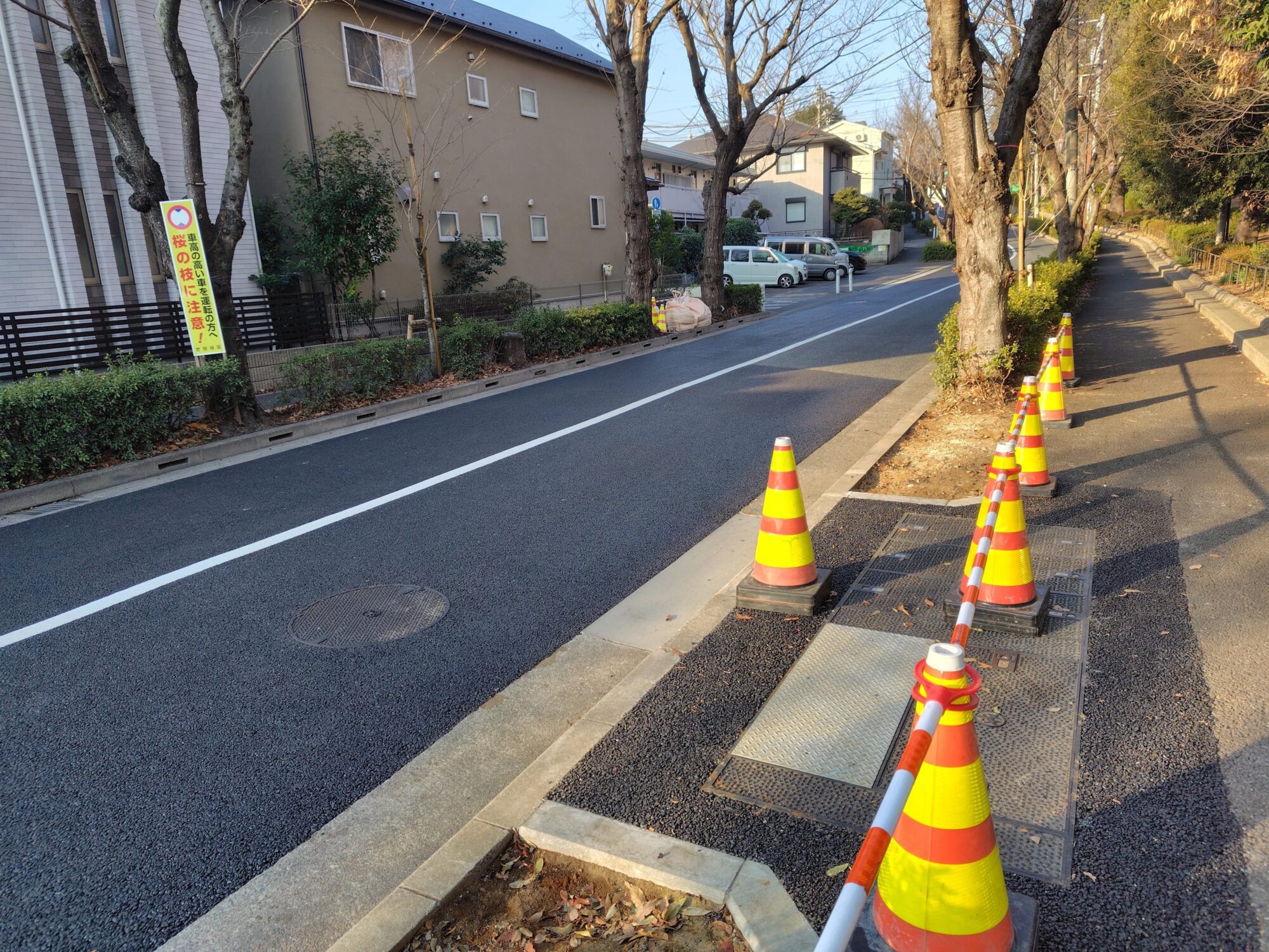 世田谷区成城と上祖師谷の間を通る桜並木「鞍橋通り」で無電柱化工事が行われています。整備区間は成城通り~鞍橋です。