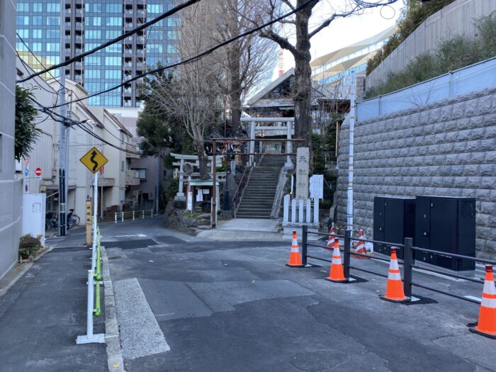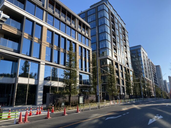港区三田1丁目に完成した高級マンション「三田ガーデンヒルズ」前の道路では無電柱化工事が進められています。