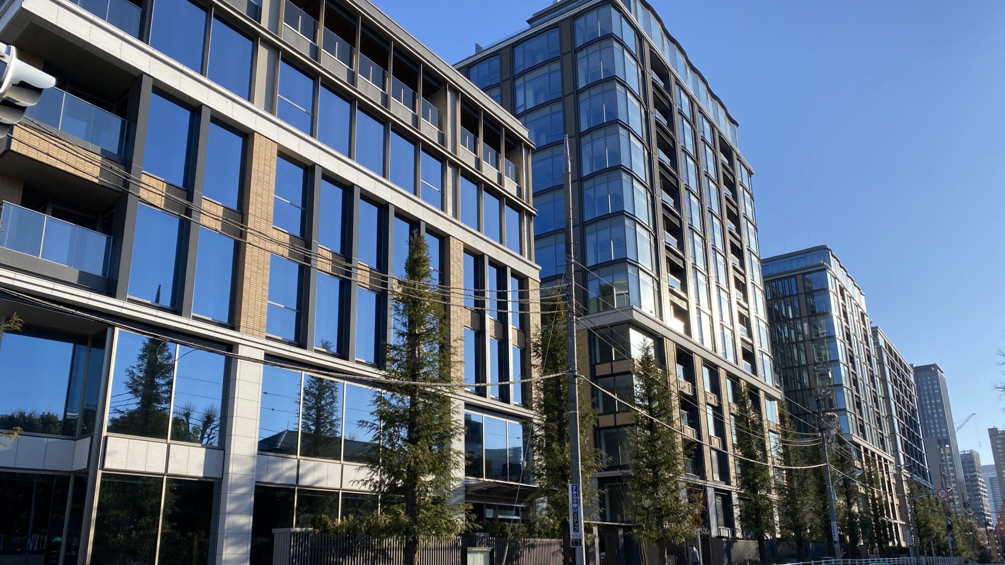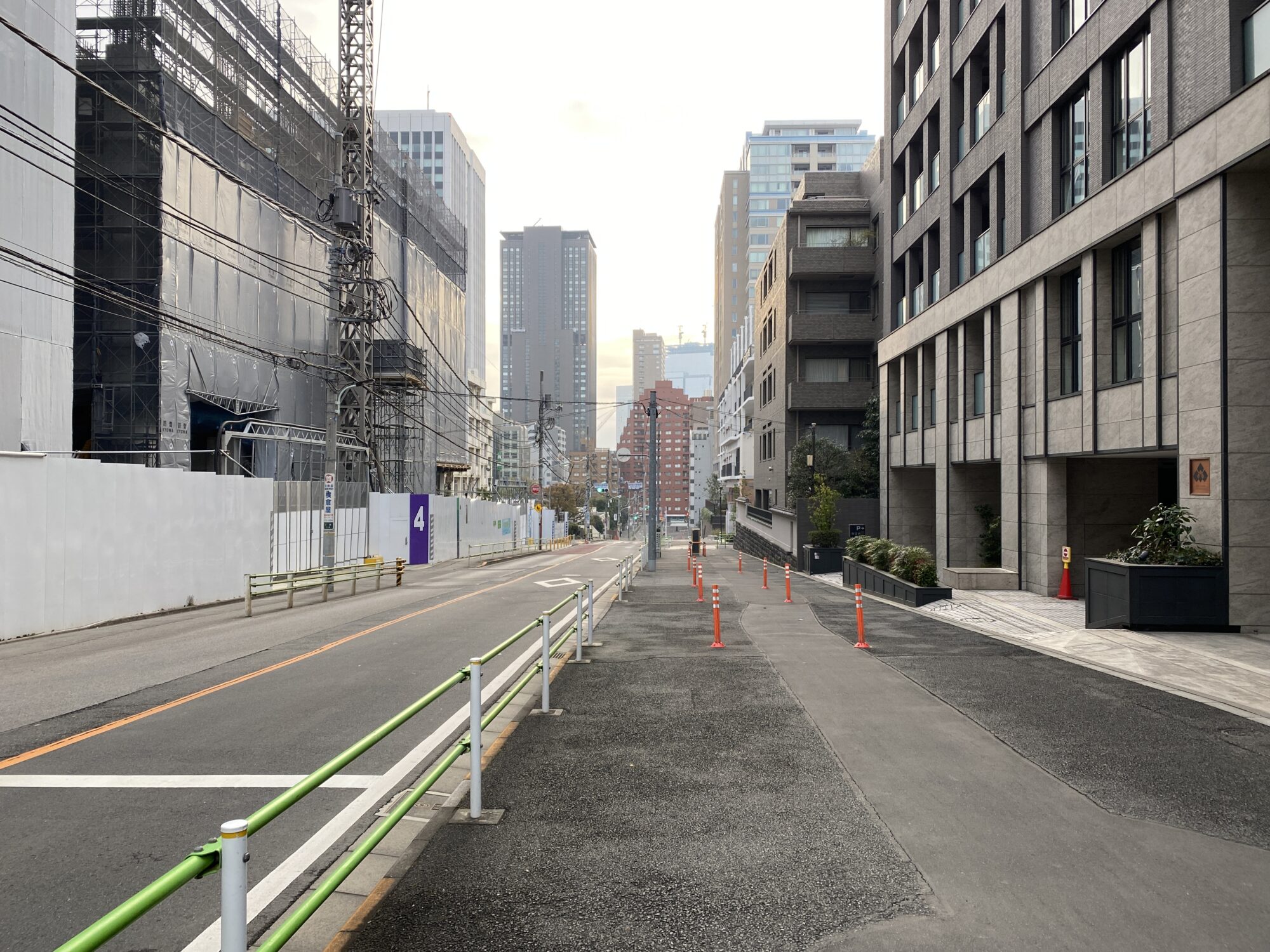 港区三田1丁目に完成した高級マンション「三田ガーデンヒルズ」前の道路では無電柱化工事が進められています。