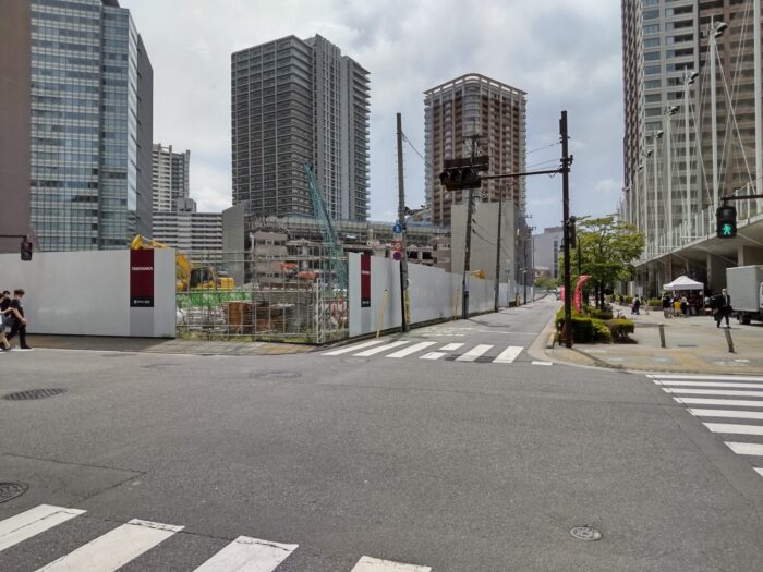 大崎駅西口で行われている再開発では、タワーマンション(建物名未定)が建設中です。この再開発にあわせて敷地南側と西側の道路が無電柱化されます。