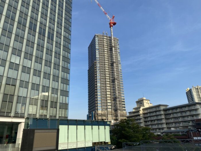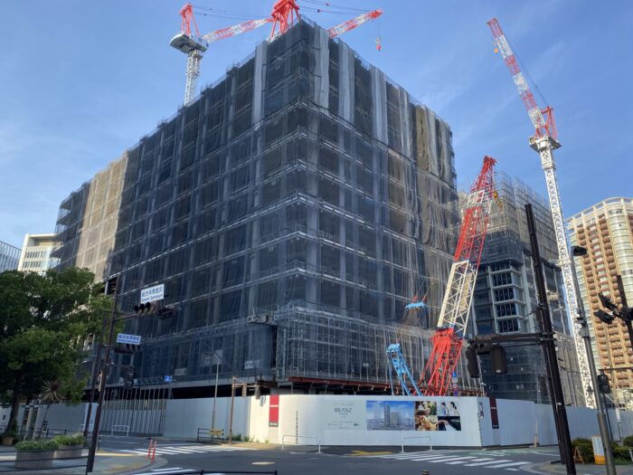 建設中の高層ビル(手前)とタワーマンション(奥)(2025年8月)
