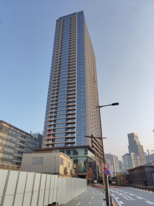 急カーブの道路とTAKANAWA GATEWAY CITY RESIDENCEの低層部分