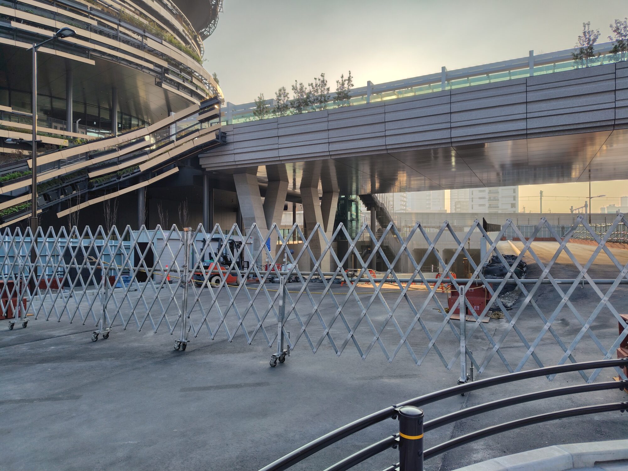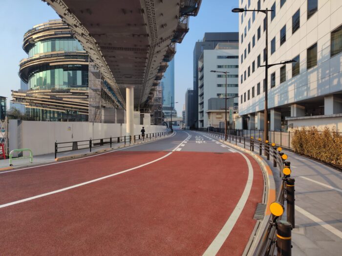 THE LINKPILLAR 1 NORTHとTHE LINKPILLAR 2の間を通る道路。バリケードで幅を狭められた仮状態です。