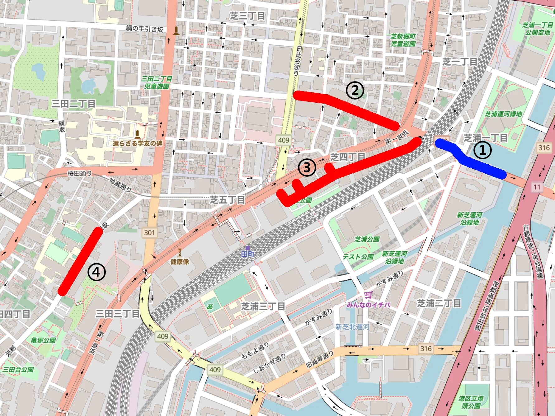 ① 国道130号(港区芝1丁目)