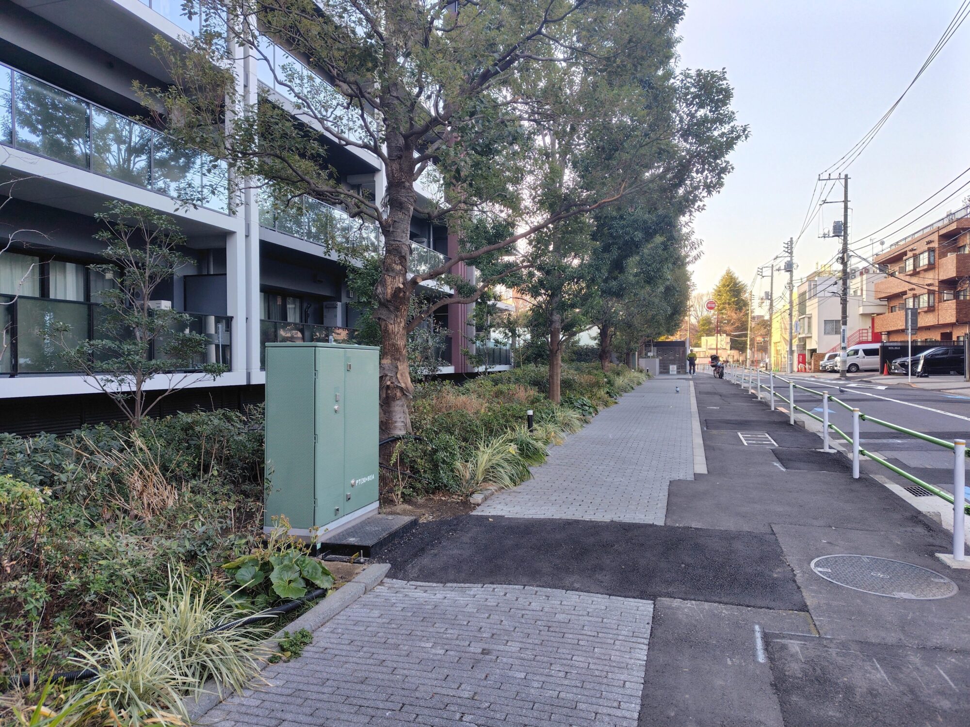 三田3・4丁目地区の再開発にあわせて敷地西側に接する道路が無電柱化されます。再開発敷地内に地上機器が設置されているのが確認できました。