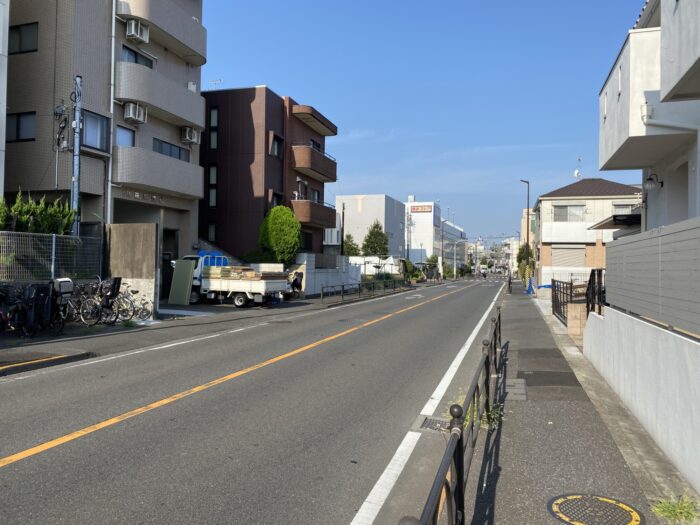 豊中通りは歩道が両側に設置されていますが幅が狭いです。電柱は歩道上の民地寄りに建っています。