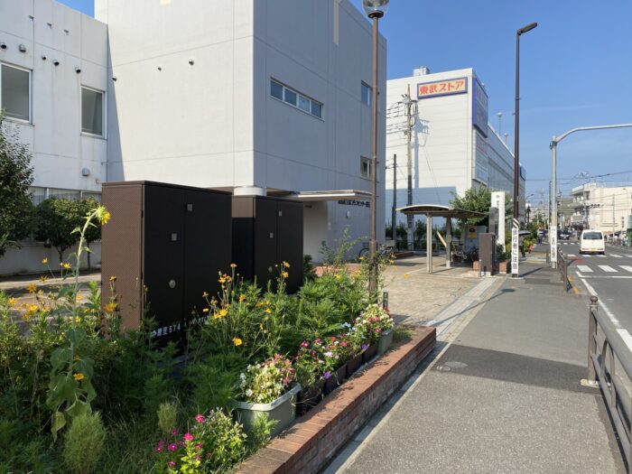 無電柱化の際に必要となる地上機器は歩道上に設置されることが一般的ですが、豊中通りは歩道が狭いため、道路外に設置されます。コンビニ(ファミリーマート)の駐車場や公共施設の敷地内に設置スペースを確保しています。