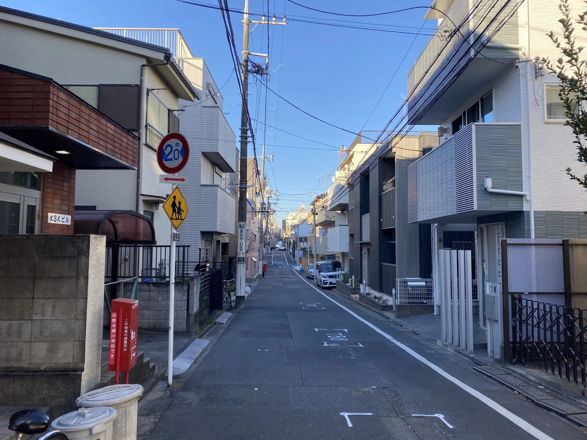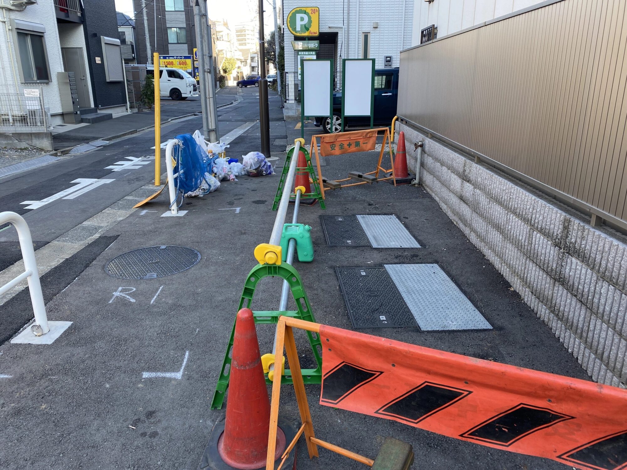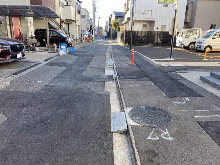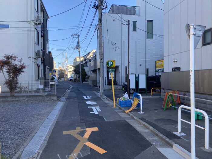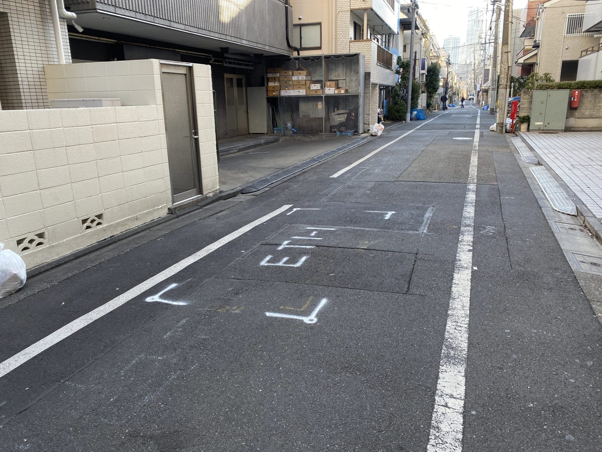 中野新橋駅近くの道路でも無電柱化が計画されています。こちらも住宅街にある生活道路です。路面には工事のためのマーキングがありました。これから工事が本格的に始まりそうです。
