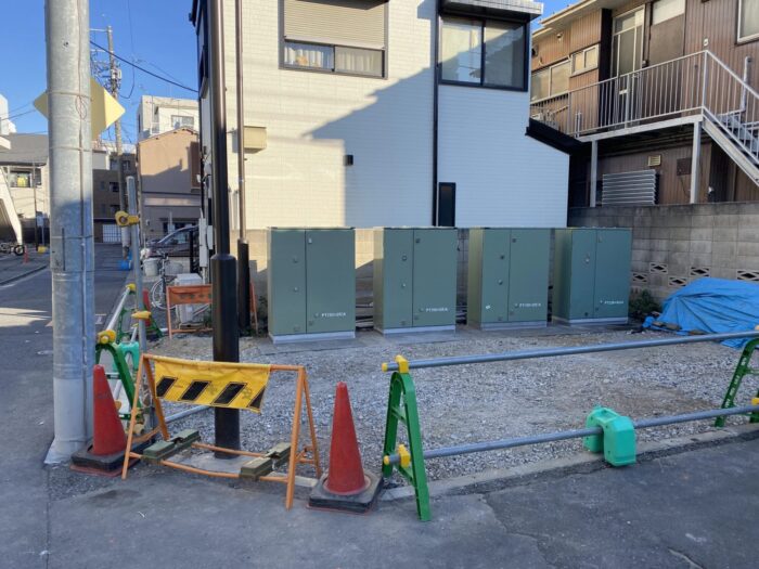 道路外に地上機器がまとめて設置されていました。こちらの土地は区が取得したのでしょうか。完成時はプチ公園のような場所になるのかもしれません。